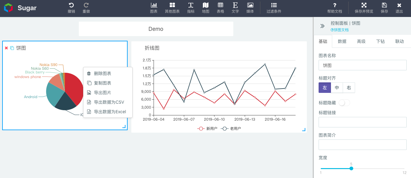 我们也支持鼠标右键功能,在某一图表上单击鼠标右键,即可对图表进行删除、复制、导出等操作,并且右键功能在浏览模式下也是支持的,如下图: