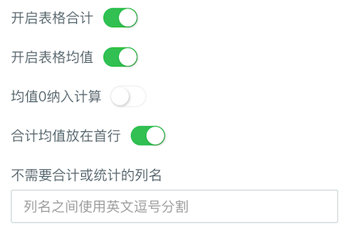 Sugar支持在表格的最后加上合计、均值,Sugar会自动判断报表各列的数据类型,只对数字类型的列做累加或均值计算,当然也支持用户显式地输入不需要计算的列 ID,如下图:
