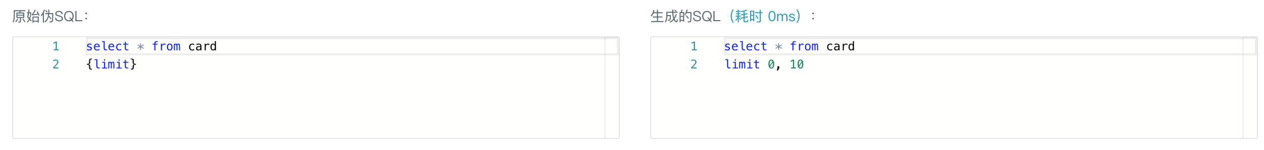 {limit}语法,如下图左侧的伪 SQL 语句(用户在切换页面时,我们会自动将伪 SQL 中的{limit}替换正确的 SQL 语句):