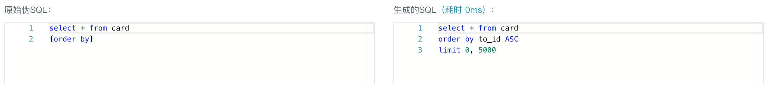 {order by}语法,如下图左侧的伪 SQL 语句(用户在切换排序规则时,我们会自动将伪 SQL 中的{order by}替换正确的 SQL 语句):