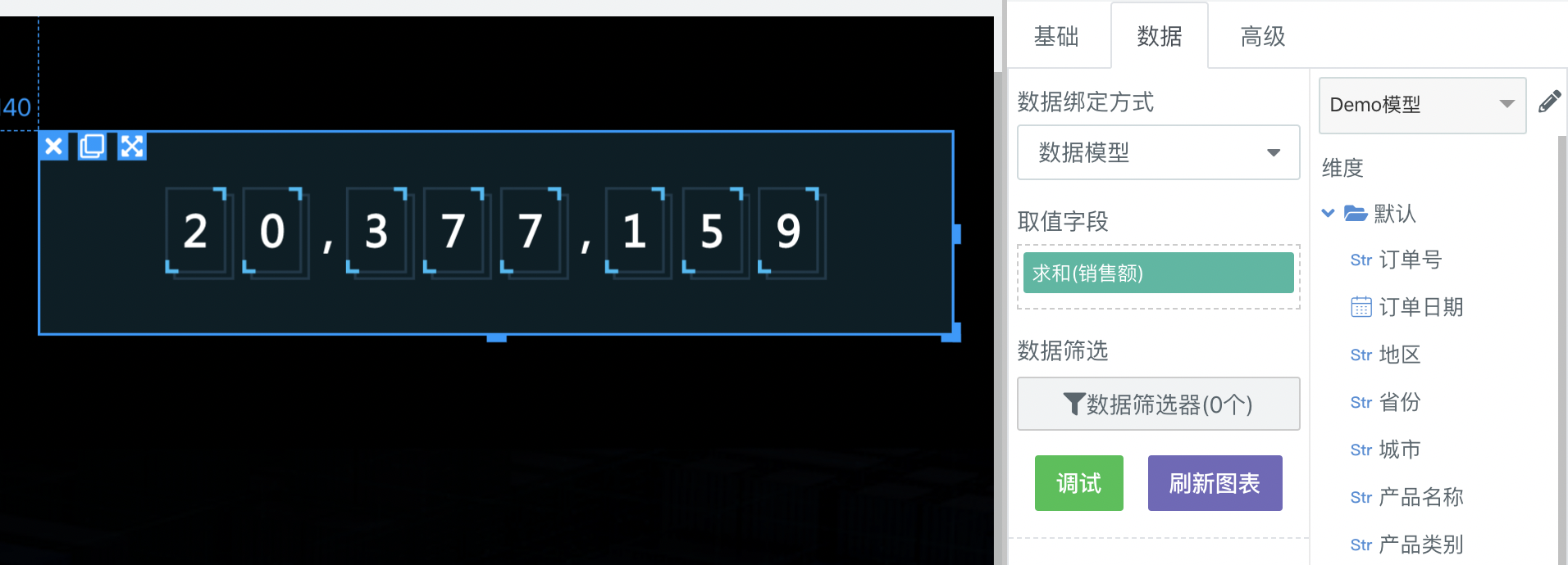 数字翻牌器是展示重要实时数据时常用的图表,在初始化或数据刷新的时候会连续变动到新的数据,在大屏中经常使用,能够非常实时动态的展示数值的增长效果: