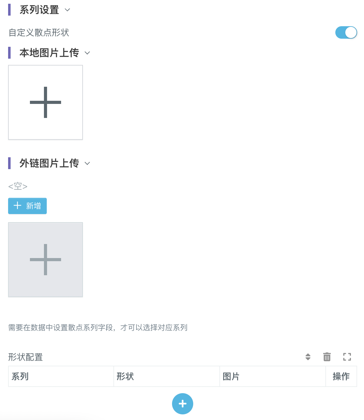 在散点、气泡图中,可以设置不同的散点形状来映射数据中不同的类型,开启自定义散点形状后,需要在数据中设置散点系列字段,才可以选择对应系列,对于 API 接口和静态 JSON,需要数据中包含 type 字段。系列设置除了可以使用Sugar内置的部分图形,还可以上传本地图片和外链图片。