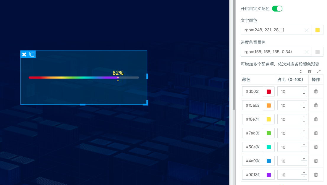 水平进度条默认的颜色是跟随主题的,如果打开了自定义颜色,则可以设置文字提示颜色,进度条背景色,以及进度条渐变的颜色和各颜色所占的百分比: