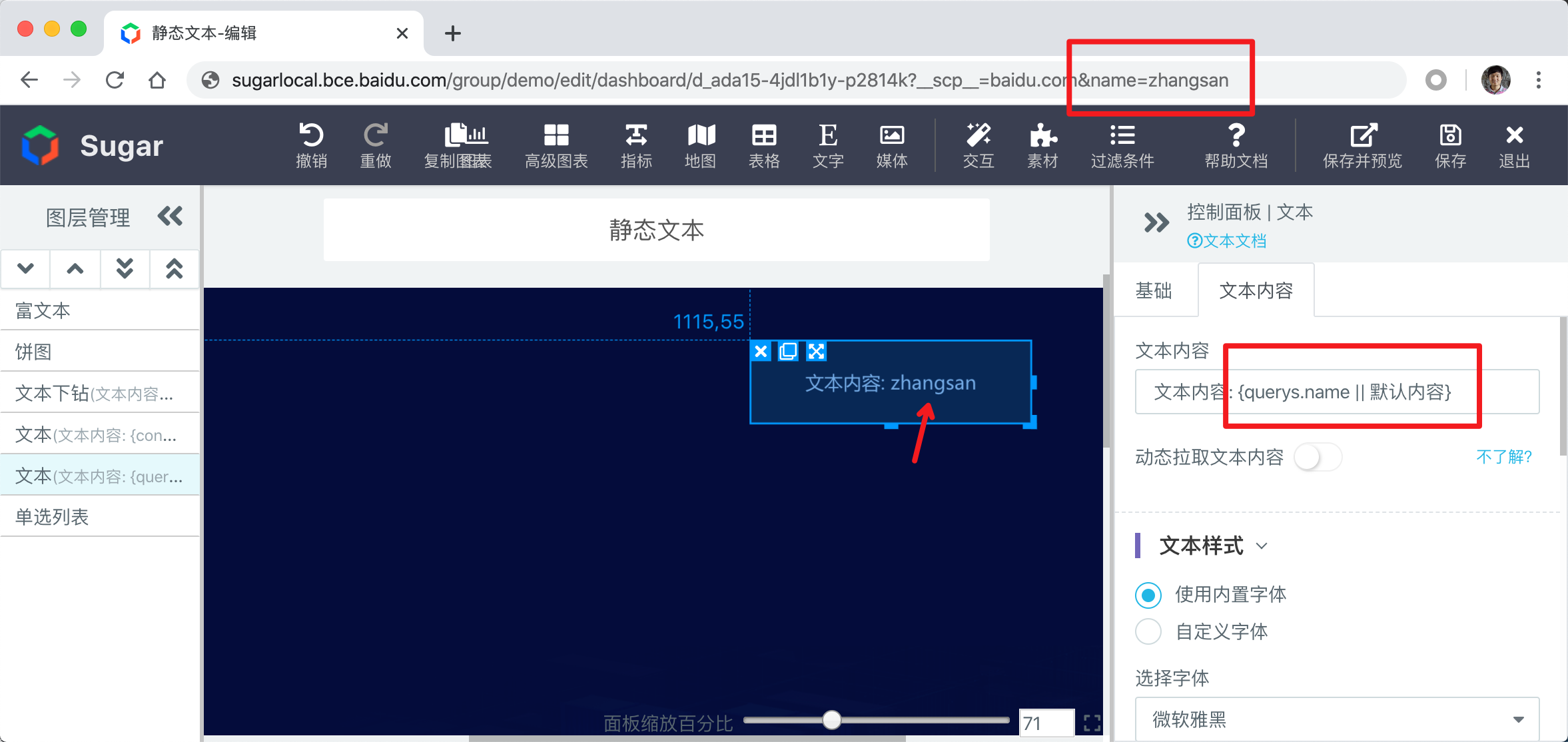 其它组件在交互的时候,可以反应到文本的内容中,Sugar中文本组件的内容支持多种嵌入语法,下面逐一介绍:
