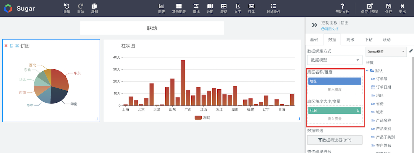 最后我们刷新柱状图的数据,即可看到柱状图已经正确的显示了「华东」地区下所有「省份」的利润数据,并且,如果我们点击饼图中的其它地区,如「华南」,柱图也会联动展示「华南」地区的各「省份」利润数据,如下: