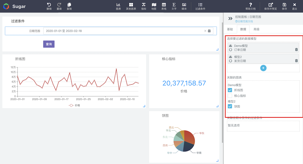 如果页面上有其它图表的使用了另外的数据模型,您只需要按照上面一样的步骤,将「日期范围」关联上那个数据模型和相应的图表即可,如下: