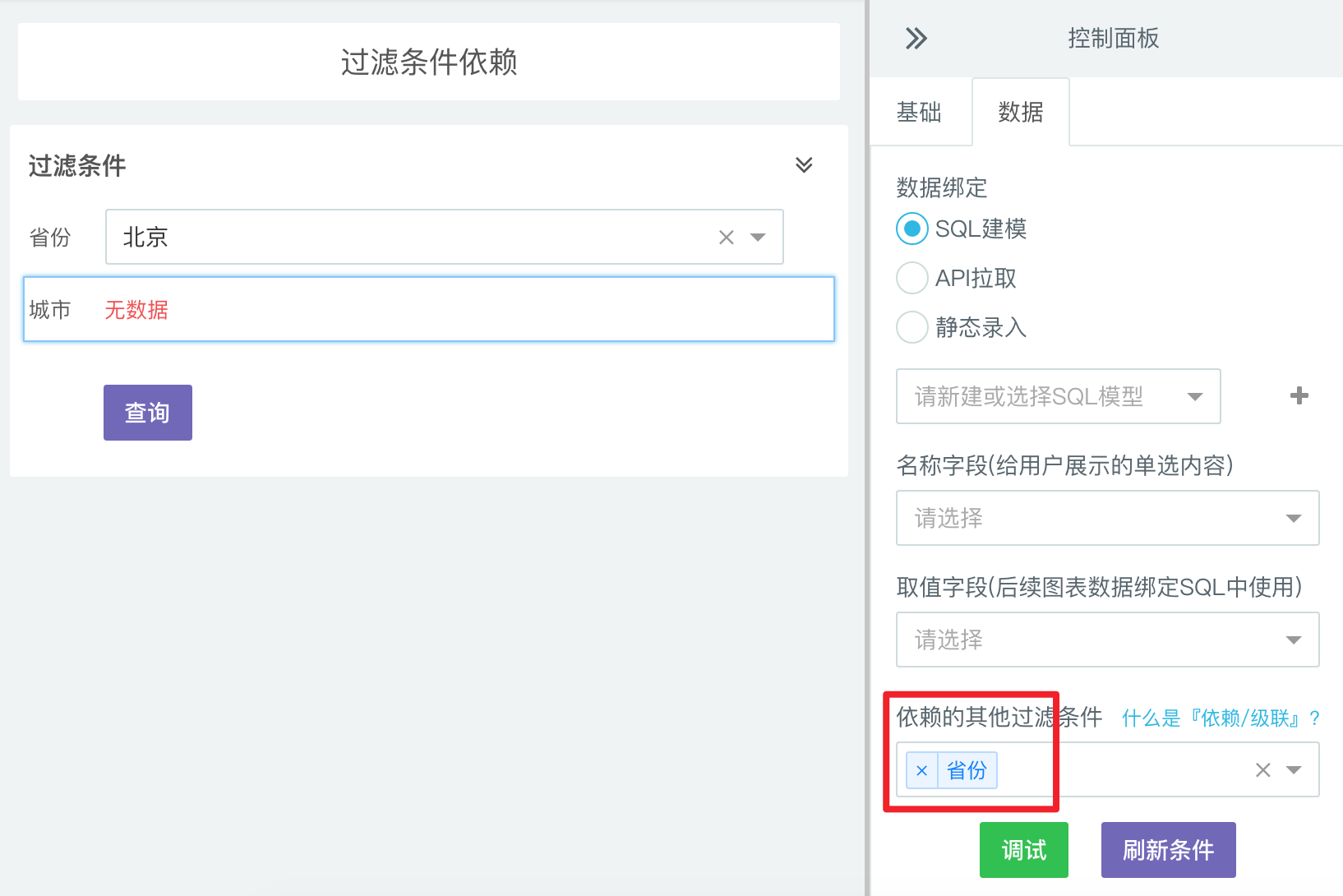 如上设置,城市过滤条件在拉取自身的数据时,如果使用的 SQL 建模方式来绑定的自身数据,我们在 SQL 语句中就可以关联省份这个过滤条件了,点击上图中的『调试』按钮: