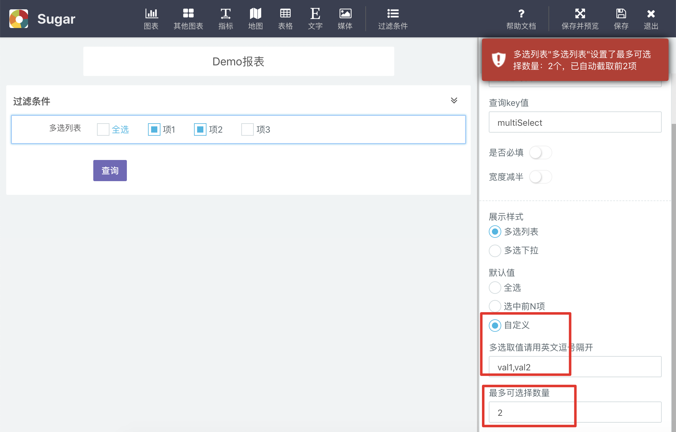 多选还支持最多可选数量的配置,超出的数量的选项会被截取,如上图设置的最多可选数量为 2,如果用户试图勾选 3 个话,就会出现上图的提示。