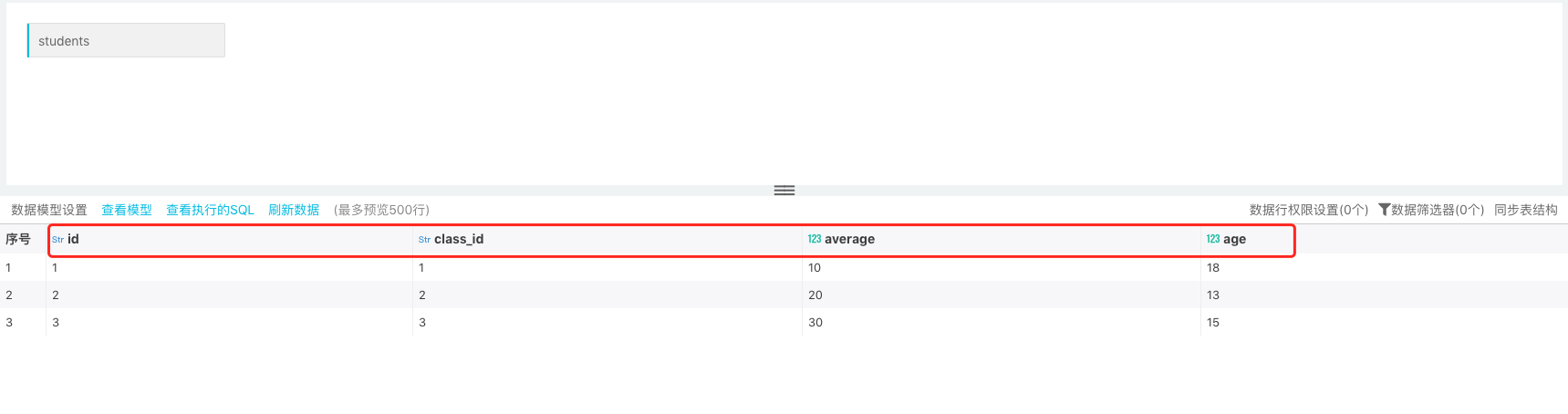 在报表制作中如遇到源表字段变化的情况,可以通过同步表结构功能进行设置,举例说明: 在下图中源表为 students,其中有四个字段 id、class_id、average 和 age。创建数据集: