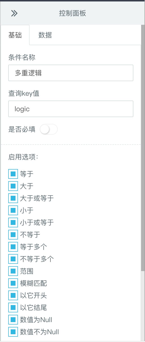 多重逻辑用来实现复杂 sql 语句的拼凑(如:between、like、in、not in 等),展示形式如下: