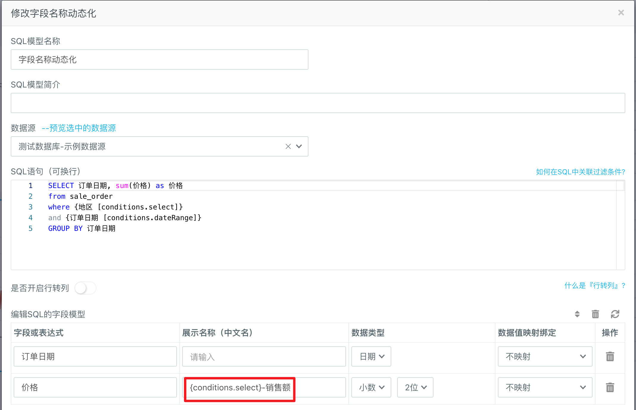 SQL 建模中字段的展示名称可以跟随不同的交互而动态改变,例如名称中嵌入过滤条件、下钻参数、联动参数等,下面详细介绍: