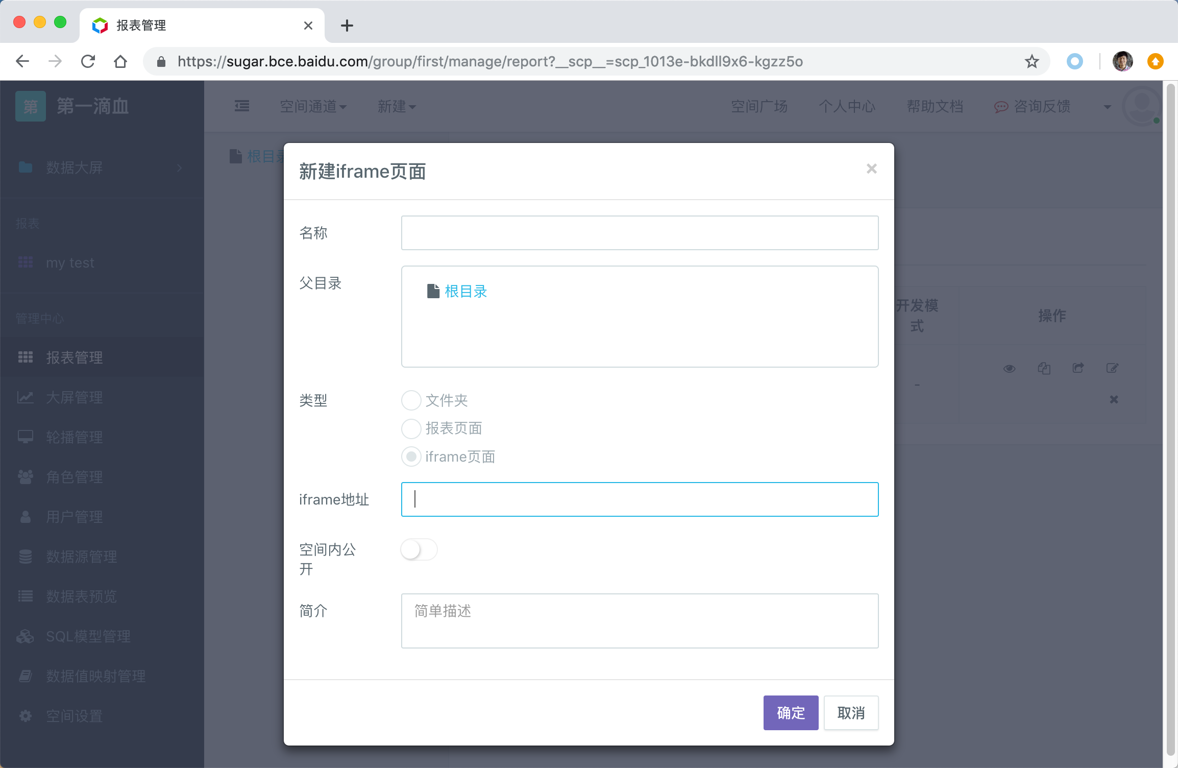 新建时需要提供报表名称,并选择所在的父级,报表可以设置「是否空间内公开」」。