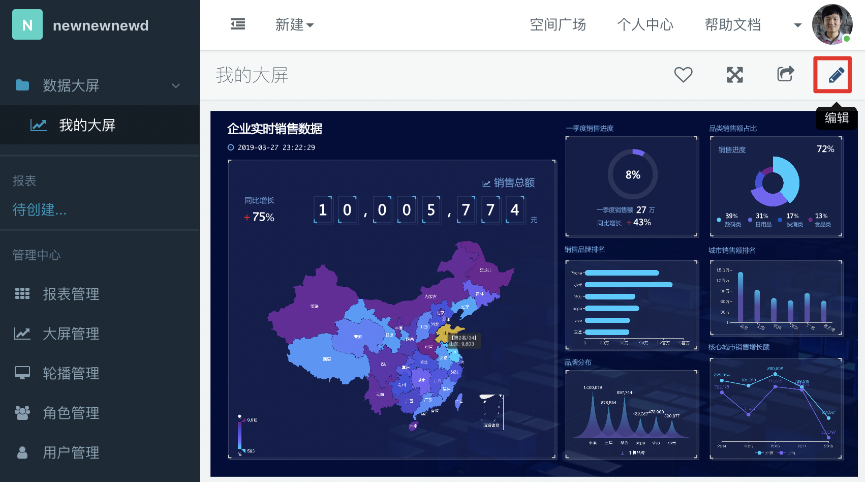 进入页面后我们可以看到基于模版新建好的大屏,点击右上角的编辑按钮即可以进入编辑模式: