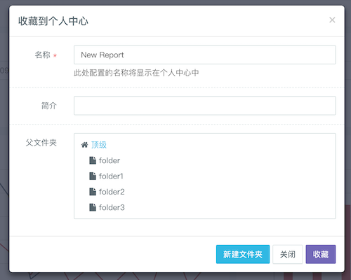 收藏到个人中心时可以给报表起一个别名,默认为报表本身的名字。个人中心中的报表也可使用文件夹结构进行组织,收藏时可以收藏到对应的文件夹下: