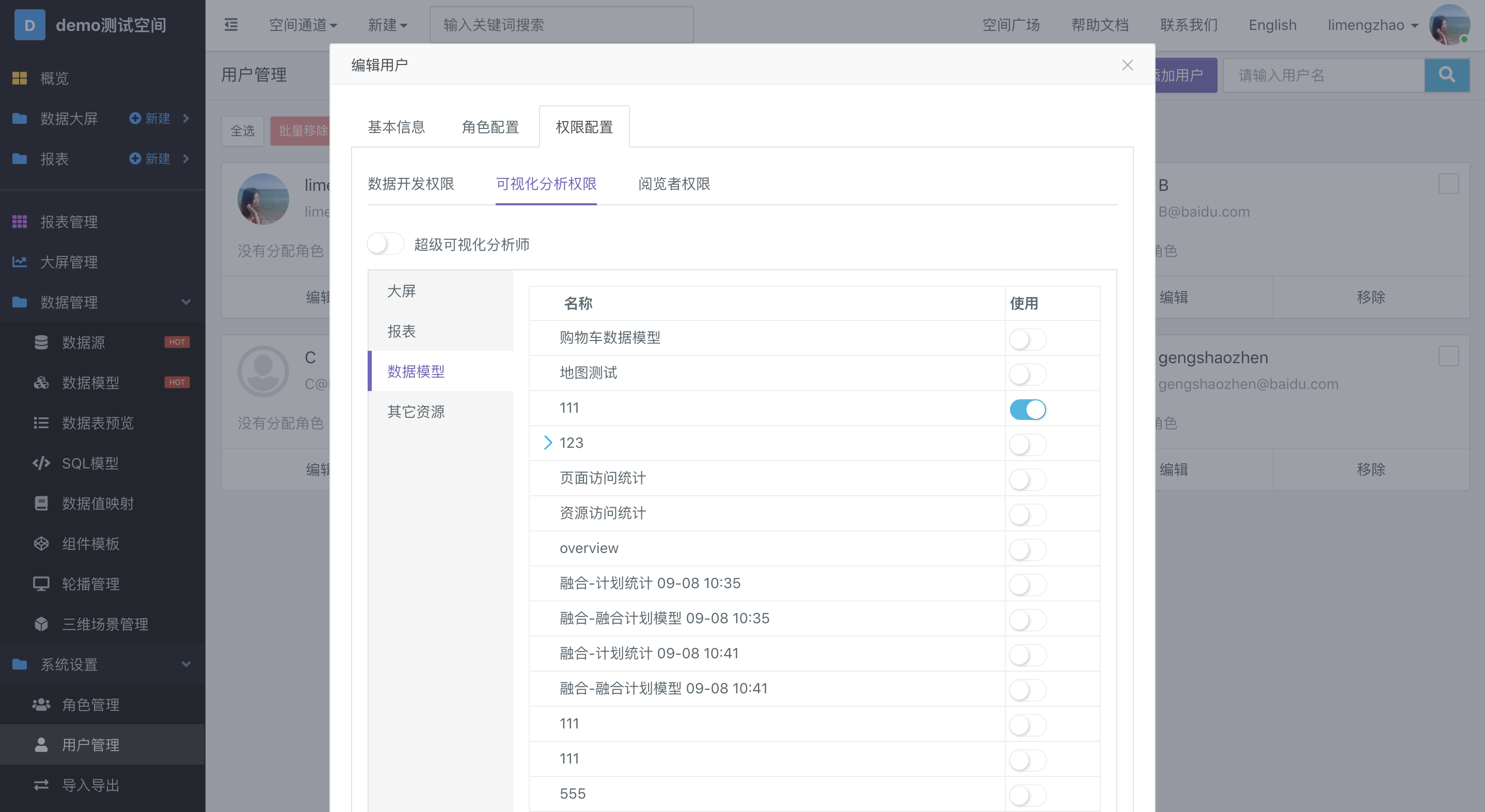 在制作报表和大屏时需要使用到数据模型,可以在此处设置数据模型的使用权限。在可视化分析权限的数据模型 tab 页中,列出了当前空间内所有的数据模型,您可以赋予用户任意数据模型的使用权限。